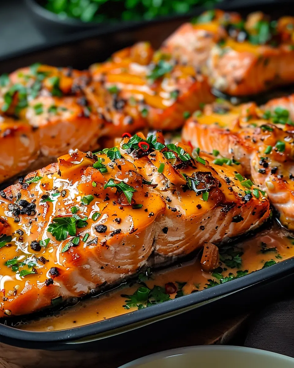 - Place the salmon fillets on a baking sheet and spread the sauce mixture over the top.