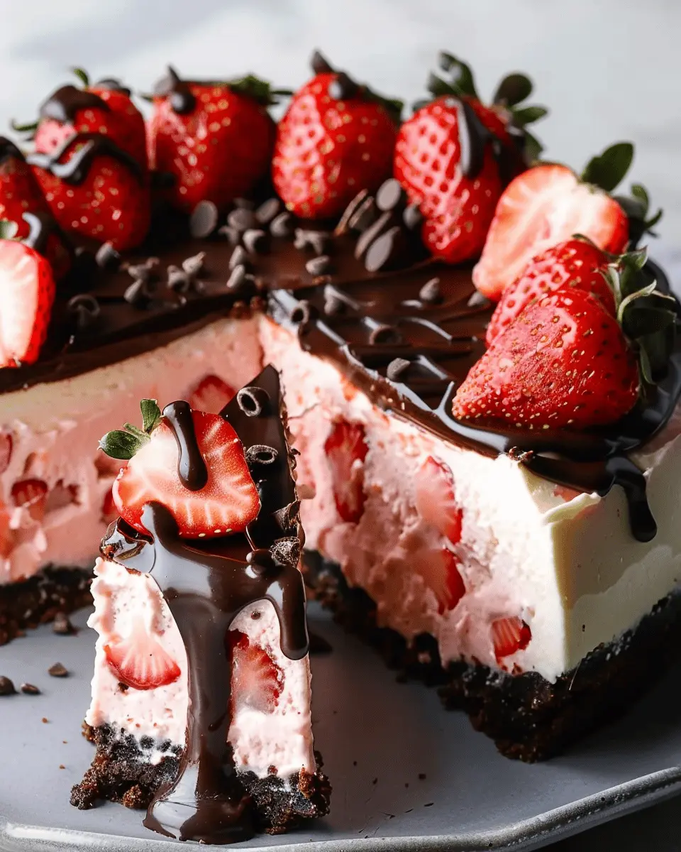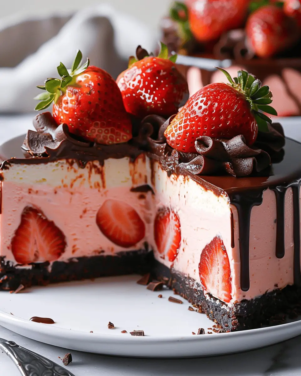 This Chocolate Covered Strawberry Cheesecake is a decadent treat combining the rich flavor of cheesecake with the sweetness of chocolate-covered strawberries.