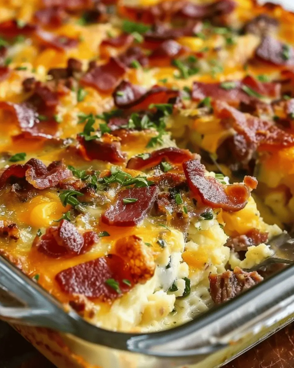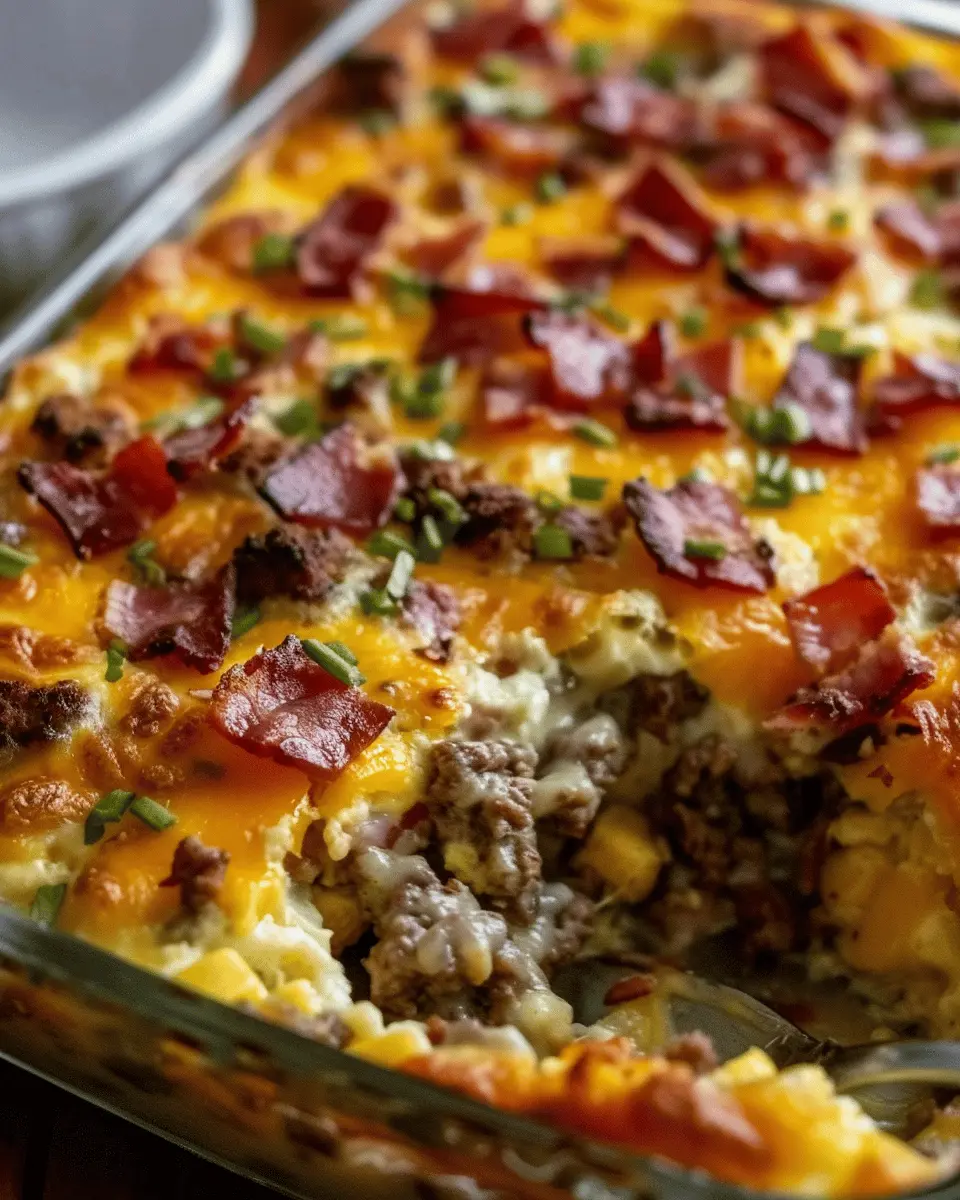 Indulge in the rich flavors of this delicious Crack Breakfast Casserole, combining turkey bacon and chicken ham for a hearty meal.