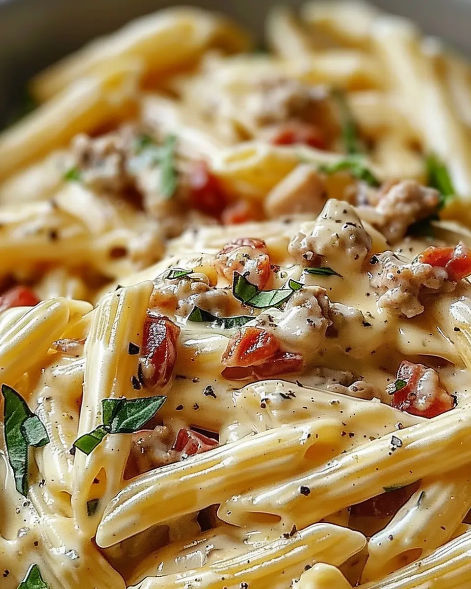 A quick and creamy pasta dish featuring Rotel tomatoes and turkey bacon for a delightful weeknight meal.