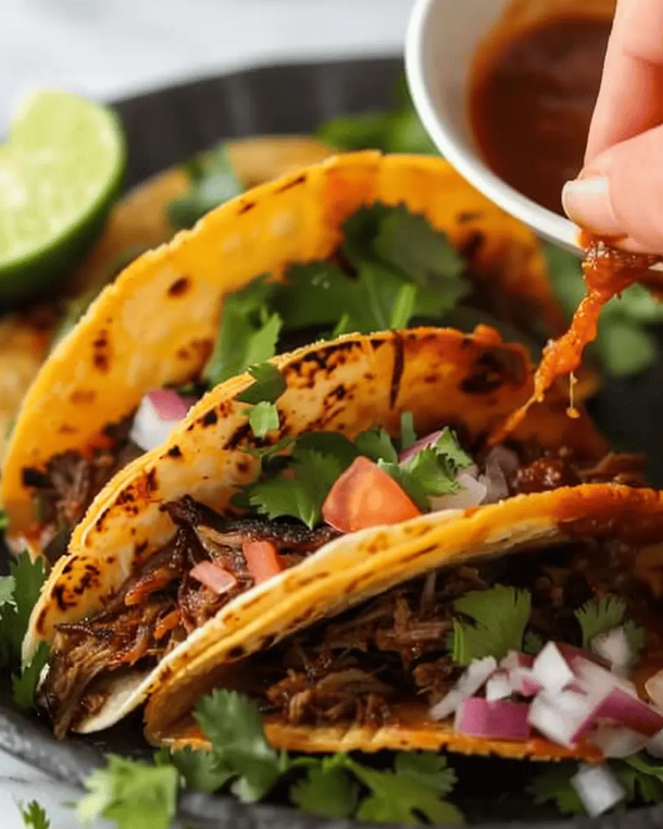 Nothing is worse than soggy tacos! To keep your easy birria tacos crispy, assemble them right before serving. When dipping tortillas in the broth, allow any excess liquid to drain off before adding the meat and toppings. Another tip is to use a hot skillet to briefly sear the assembled tacos for that perfect crunch.