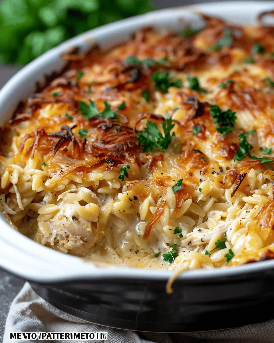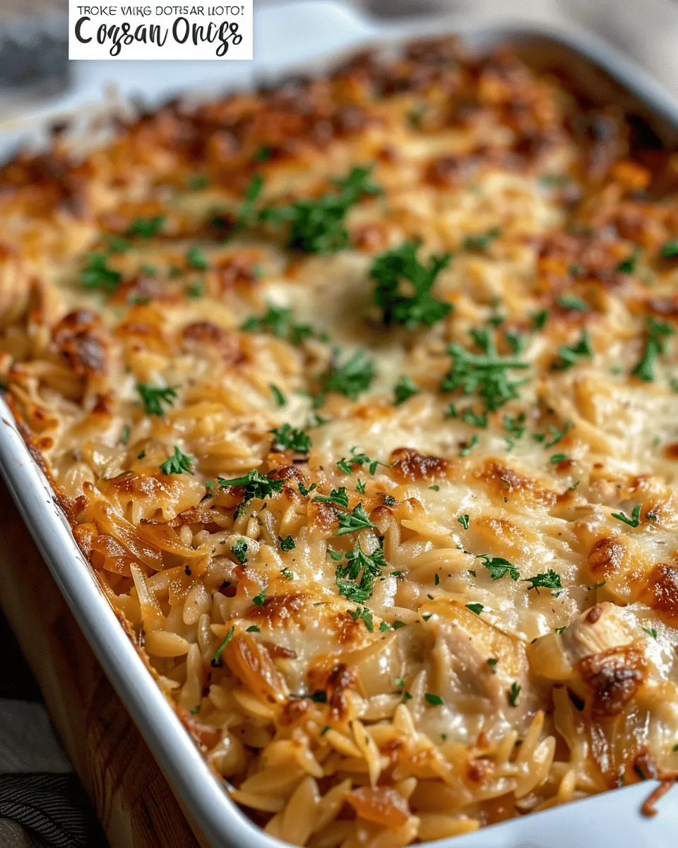 A creamy, cheesy casserole loaded with the rich flavor of French onion soup, tender chicken, and orzo pasta.