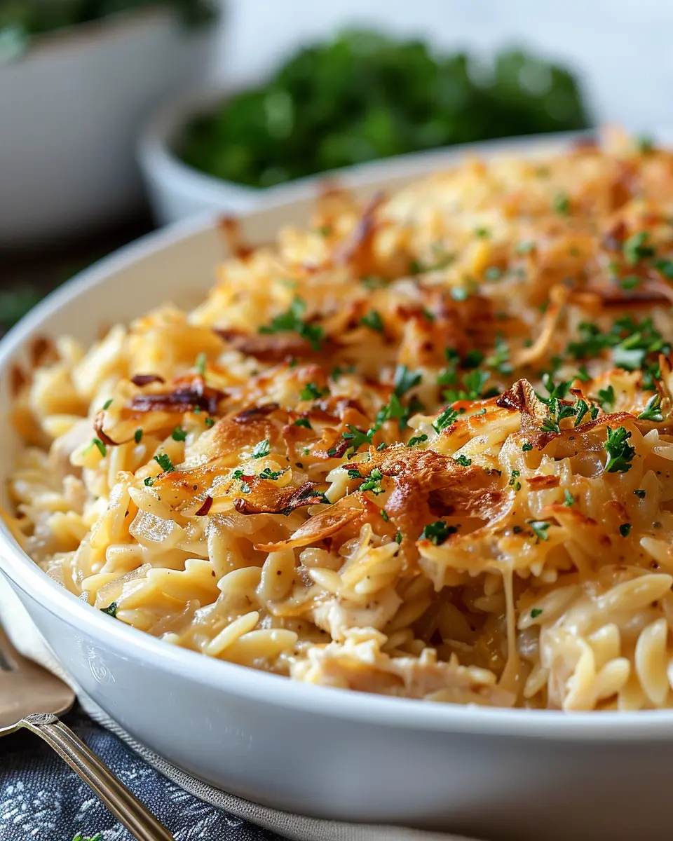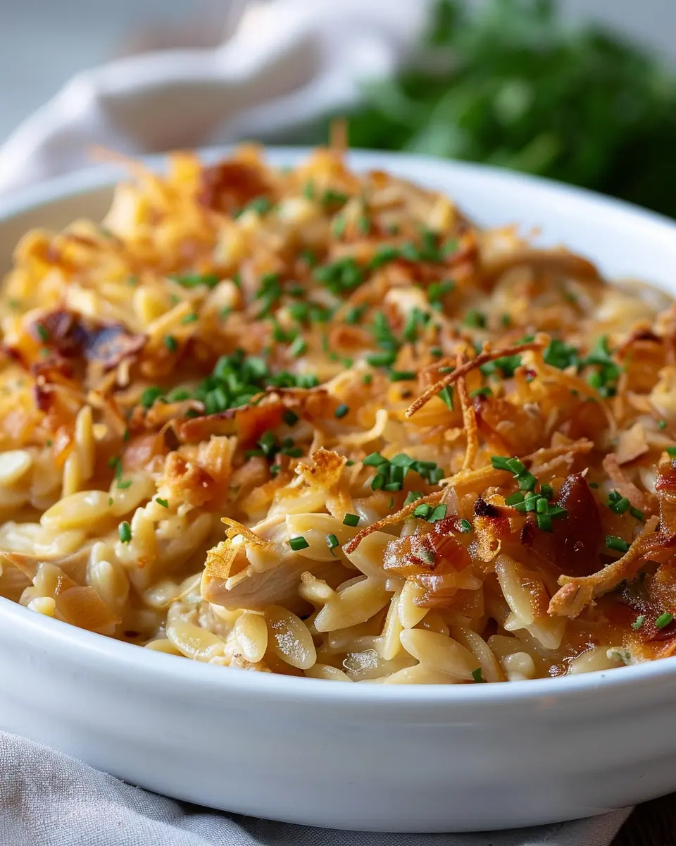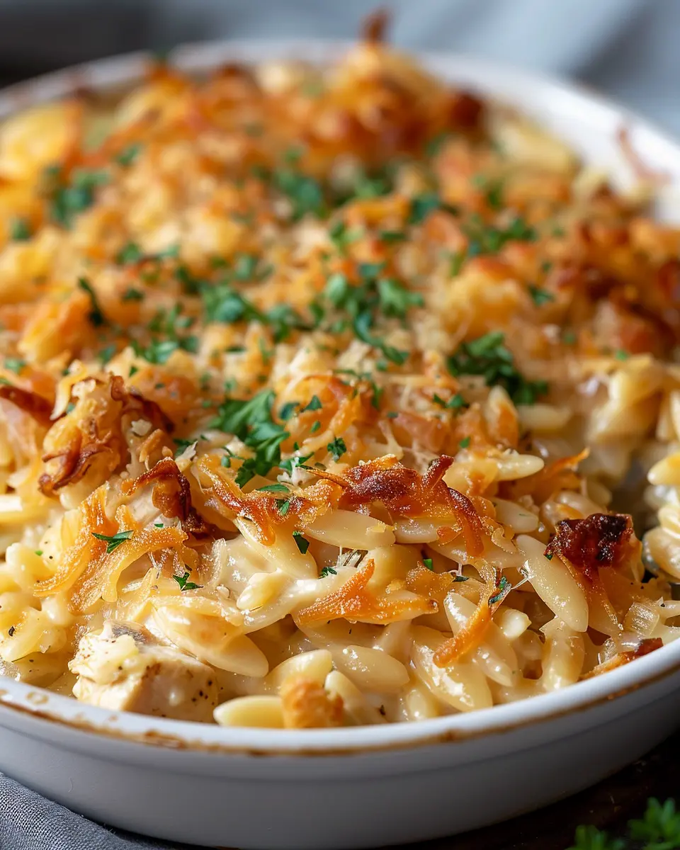 A delightful casserole that brings together the flavors of French onion soup with tender chicken and orzo pasta.