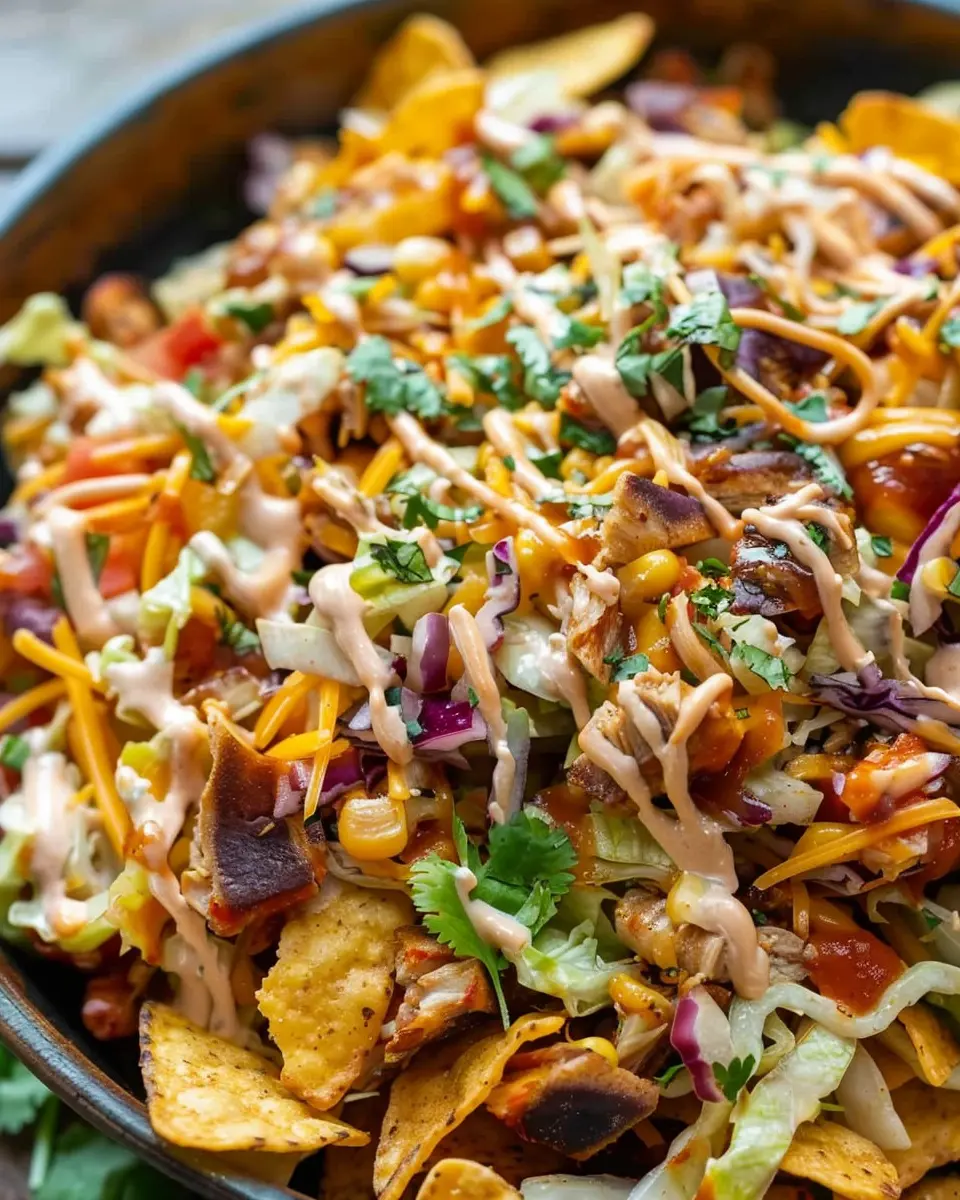 Finally, for the piรจce de rรฉsistanceโdonโt forget the Fritos! Just before serving, sprinkle a generous handful of Fritos on top of your salad. These crunchy corn chips not only provide texture but also add that distinct flavor that complements the dish so well.