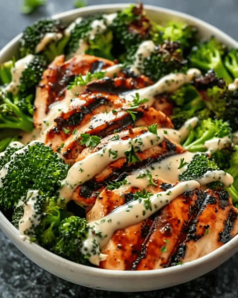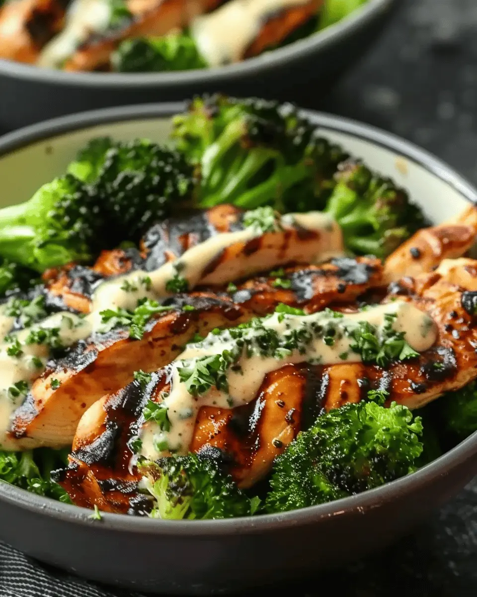 PrintGrilled Chicken Broccoli Bowls: Easy Creamy Garlic Delight