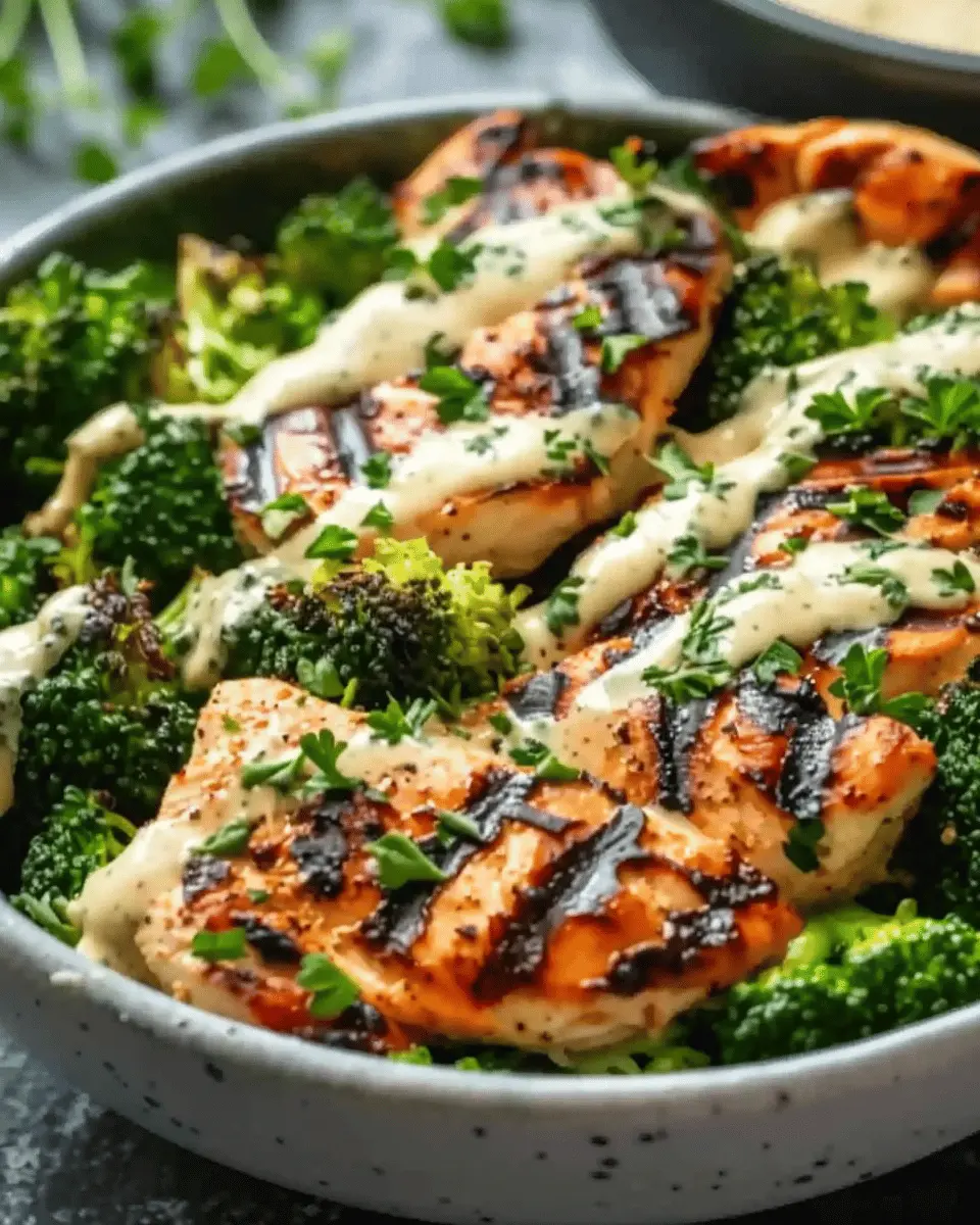 Keywords: Grilled Chicken, Broccoli, Creamy Garlic Sauce