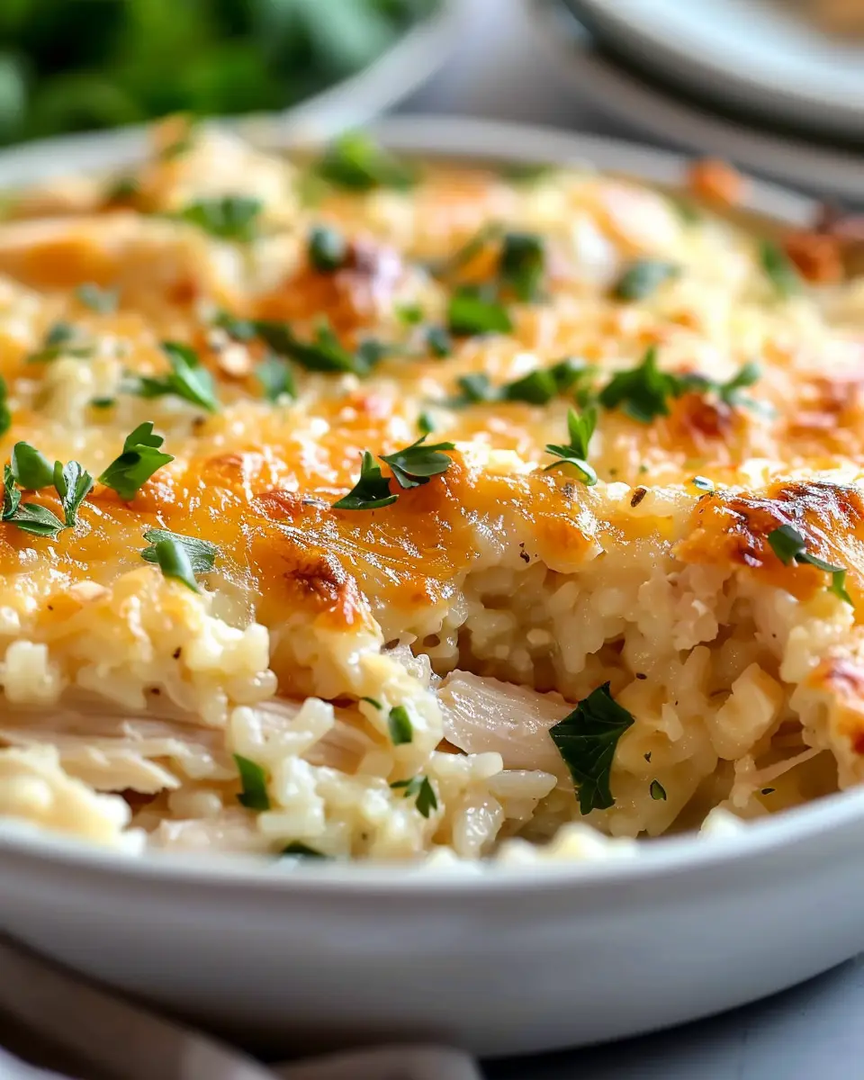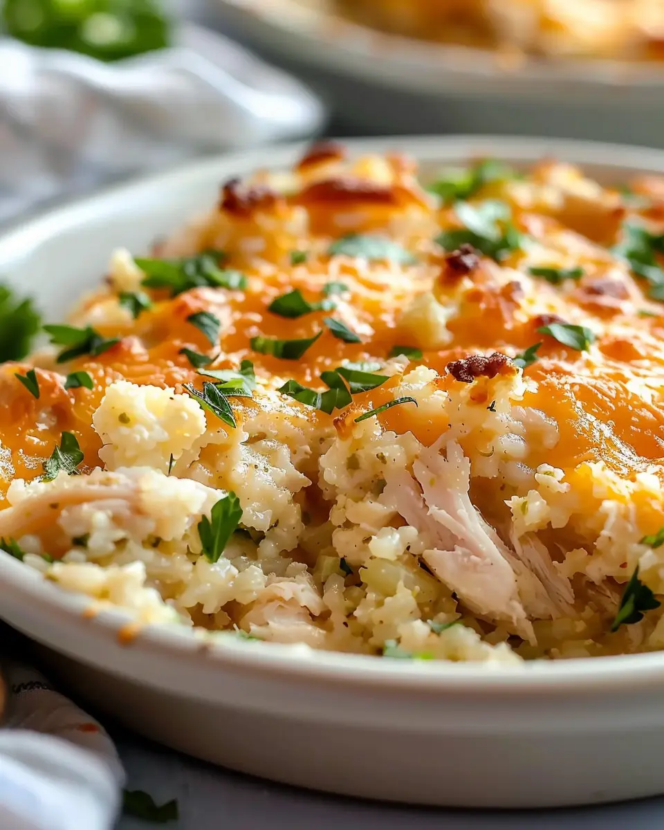 Adding a few garnishes can make your healthy chicken cauliflower rice casserole look as good as it tastes! Chopped fresh herbs like parsley or cilantro offer a pop of color and a burst of flavor. A sprinkle of nutritional yeast can add a cheesy essence without the calories.