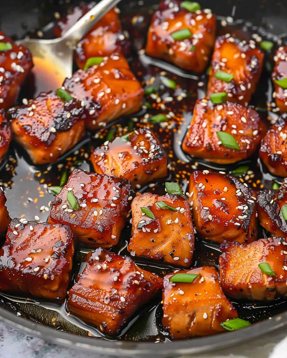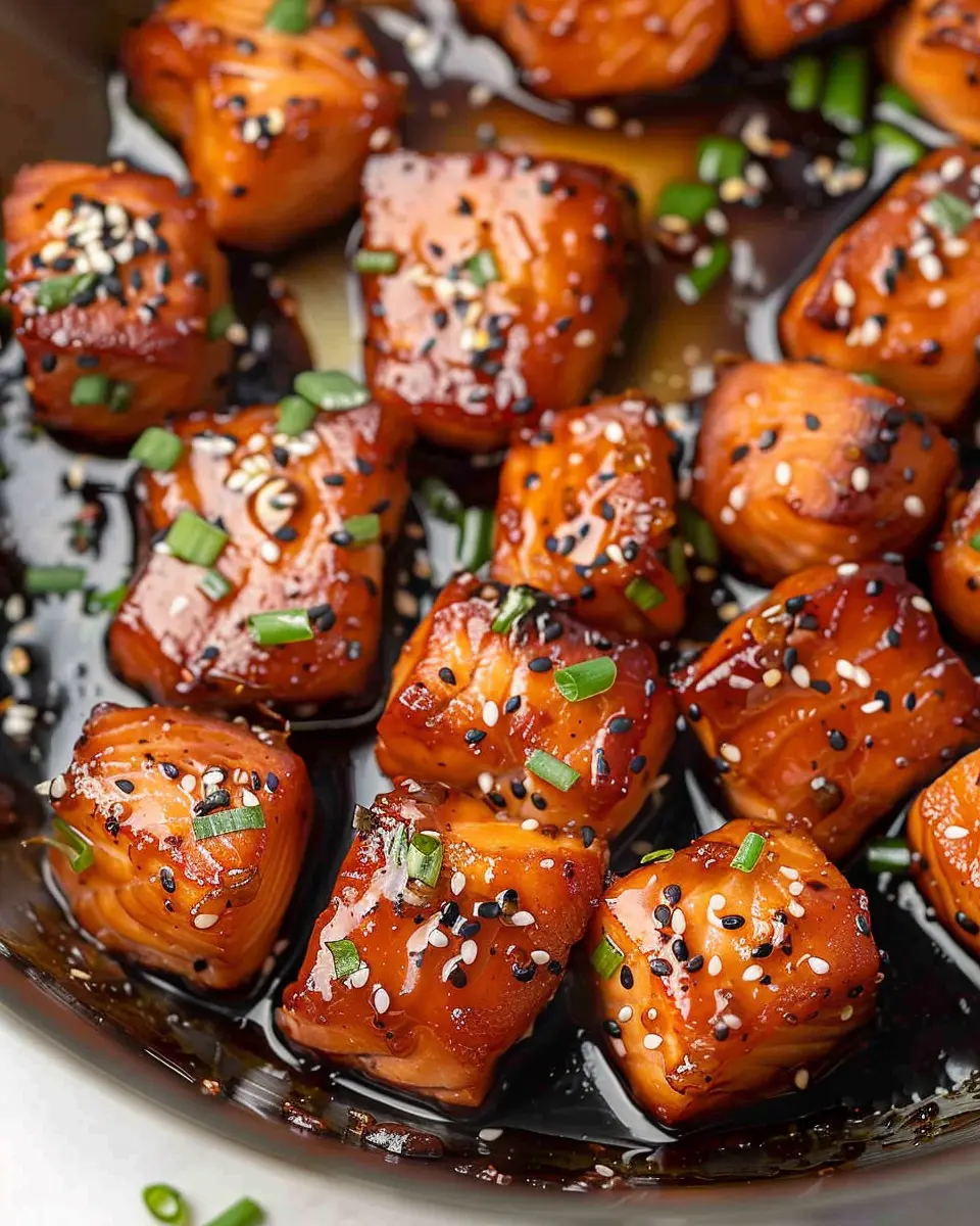 Coat the Salmon: In a bowl, gently toss the cooked salmon bites in the honey garlic sauce until they are fully coated. You can reserve some sauce for drizzling when serving.