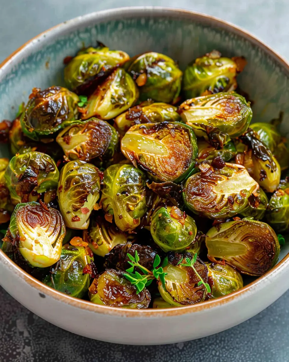 Deliciously roasted Brussels sprouts enhanced with brown butter, hot honey, and crispy turkey bacon give a delightful twist to a classic side dish.