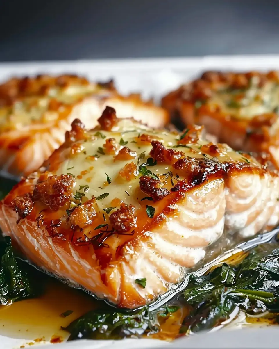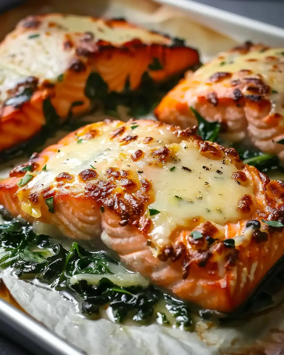 Once your salmon is perfectly seared, it’s time to assemble your delicious meal. In a baking dish, lay the salmon fillets skin-side down, creating a cozy bed for the spinach mixture. Spoon the creamy spinach filling generously over each fillet, allowing it to cascade down the sides.