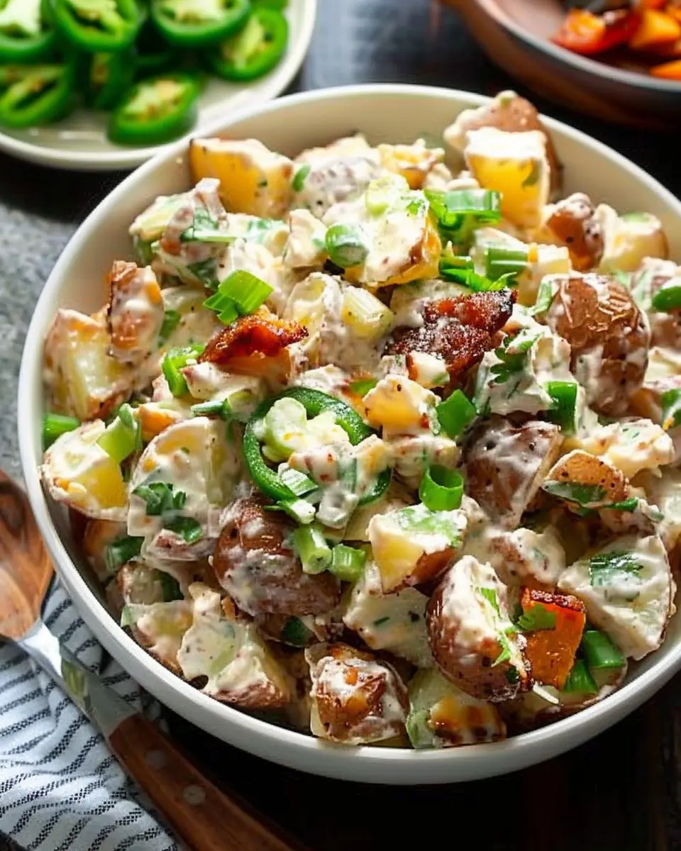 A creamy and spicy potato salad packed with flavor from jalapenos, turkey bacon, and a delightful dressing.