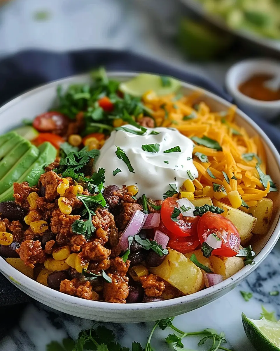 A delicious Loaded Potato Taco Bowl featuring turkey bacon and chicken ham that will make your taste buds dance.