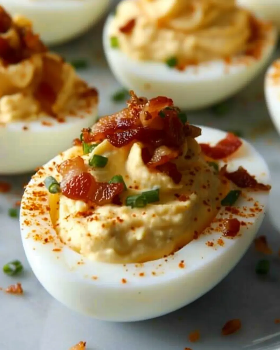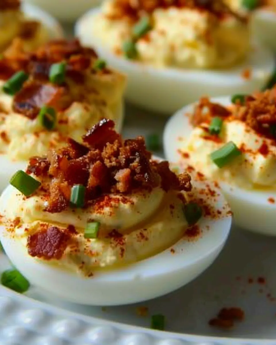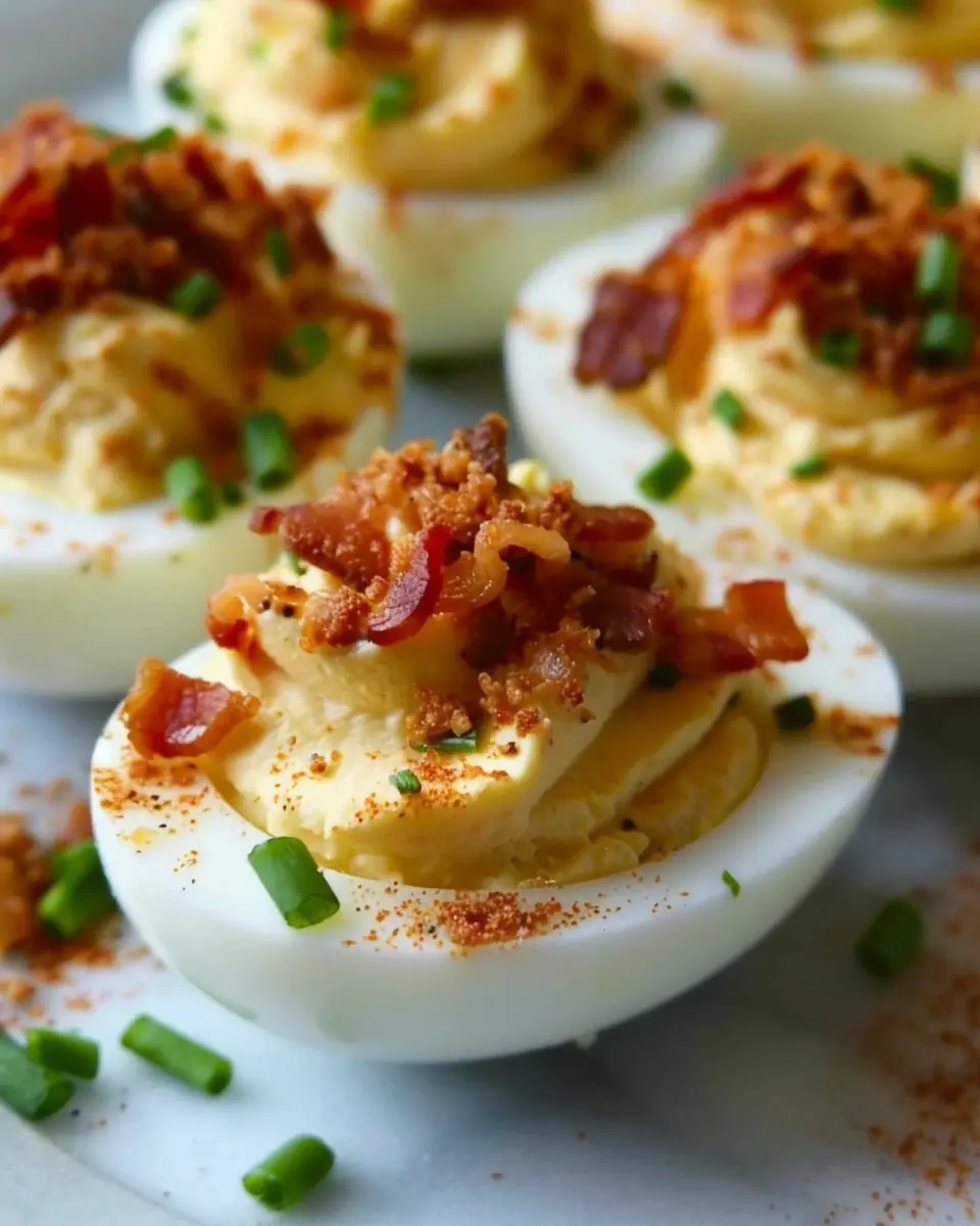 Experience the irresistible flavor of Million Dollar Bacon Deviled Eggs, a perfect combination of creamy goodness and savory bacon.