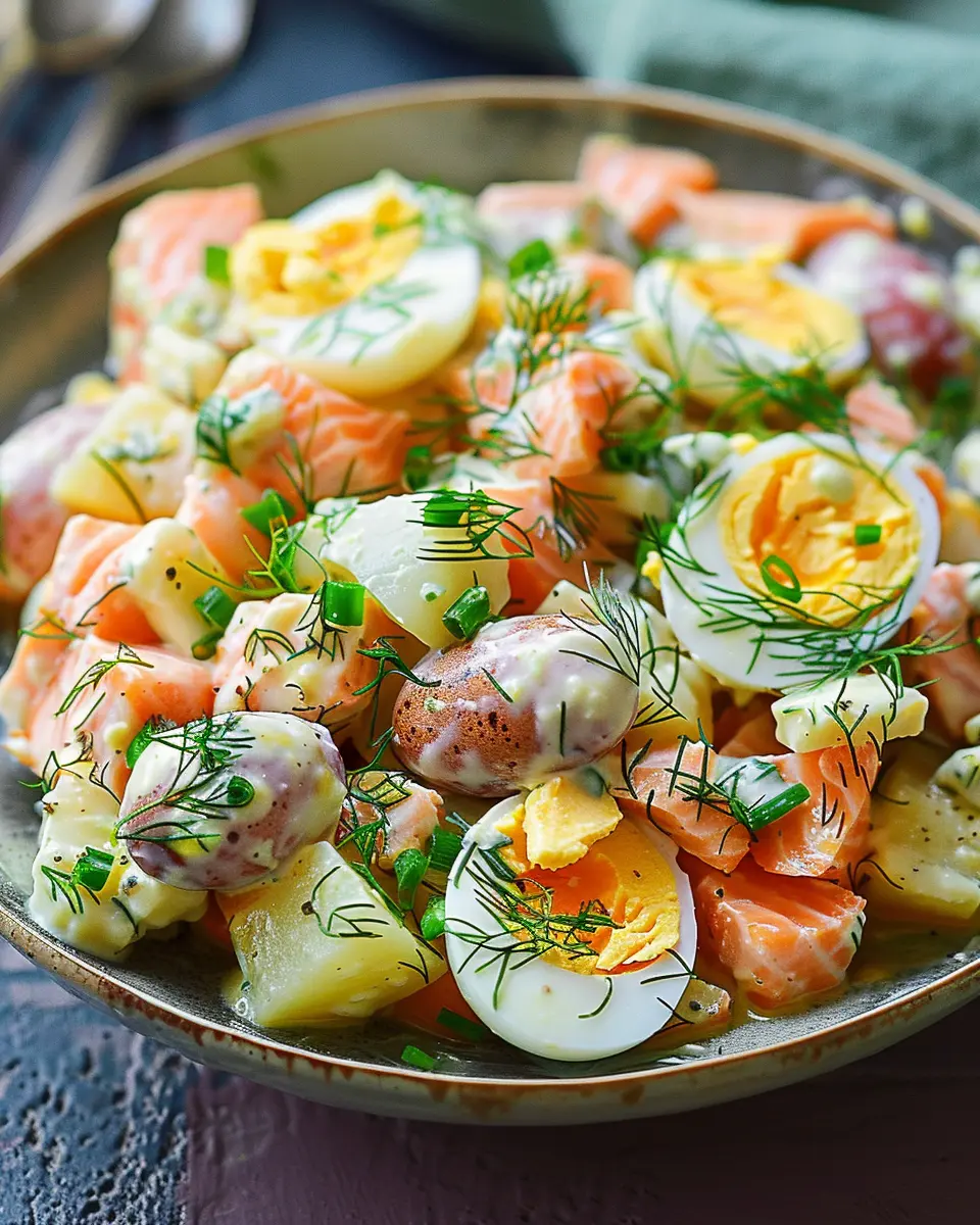 Quick and Easy: This salad comes together quickly, taking around 30 minutes. With simple ingredients like boiled potatoes, smoked salmon, and hard-boiled eggs, you can whip it up without hassle.