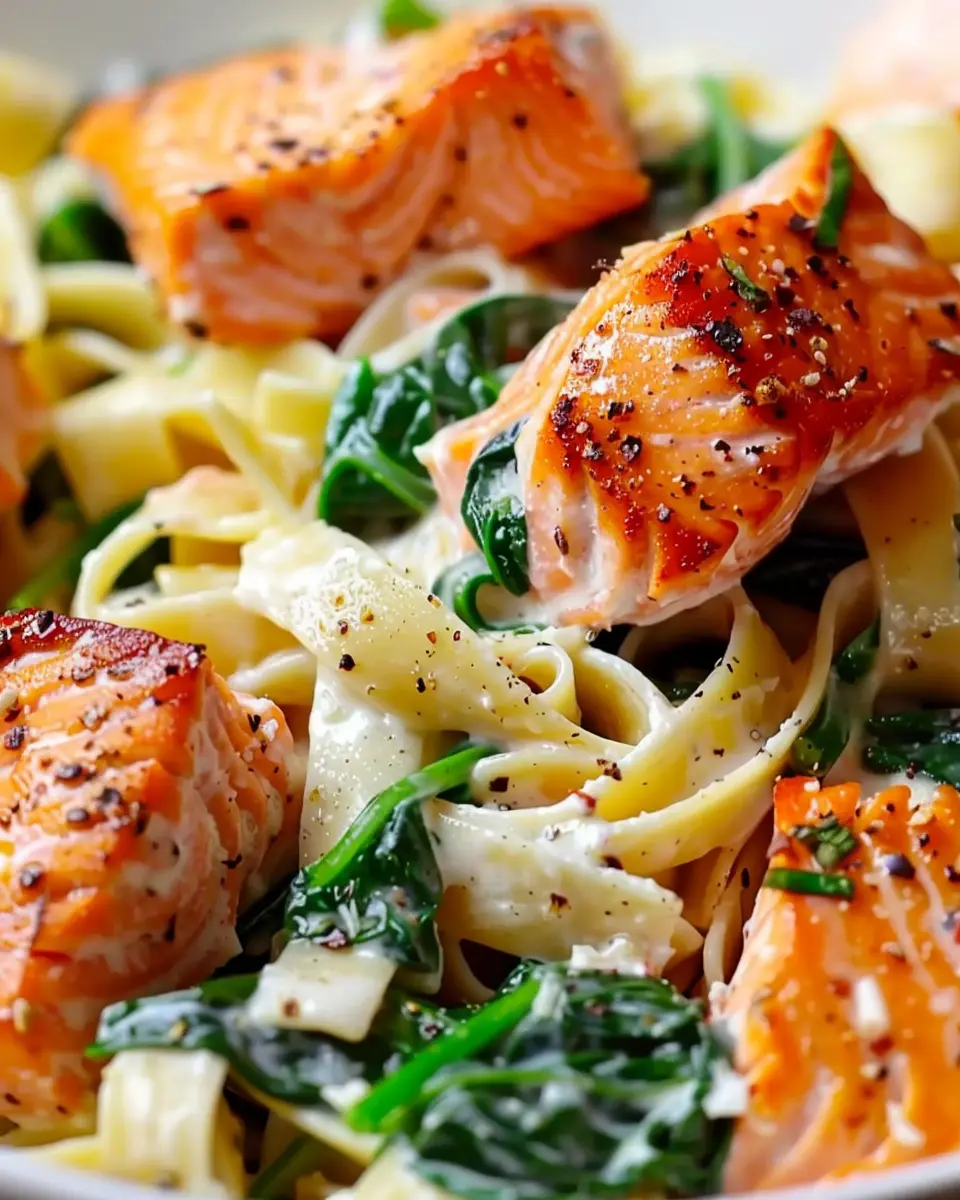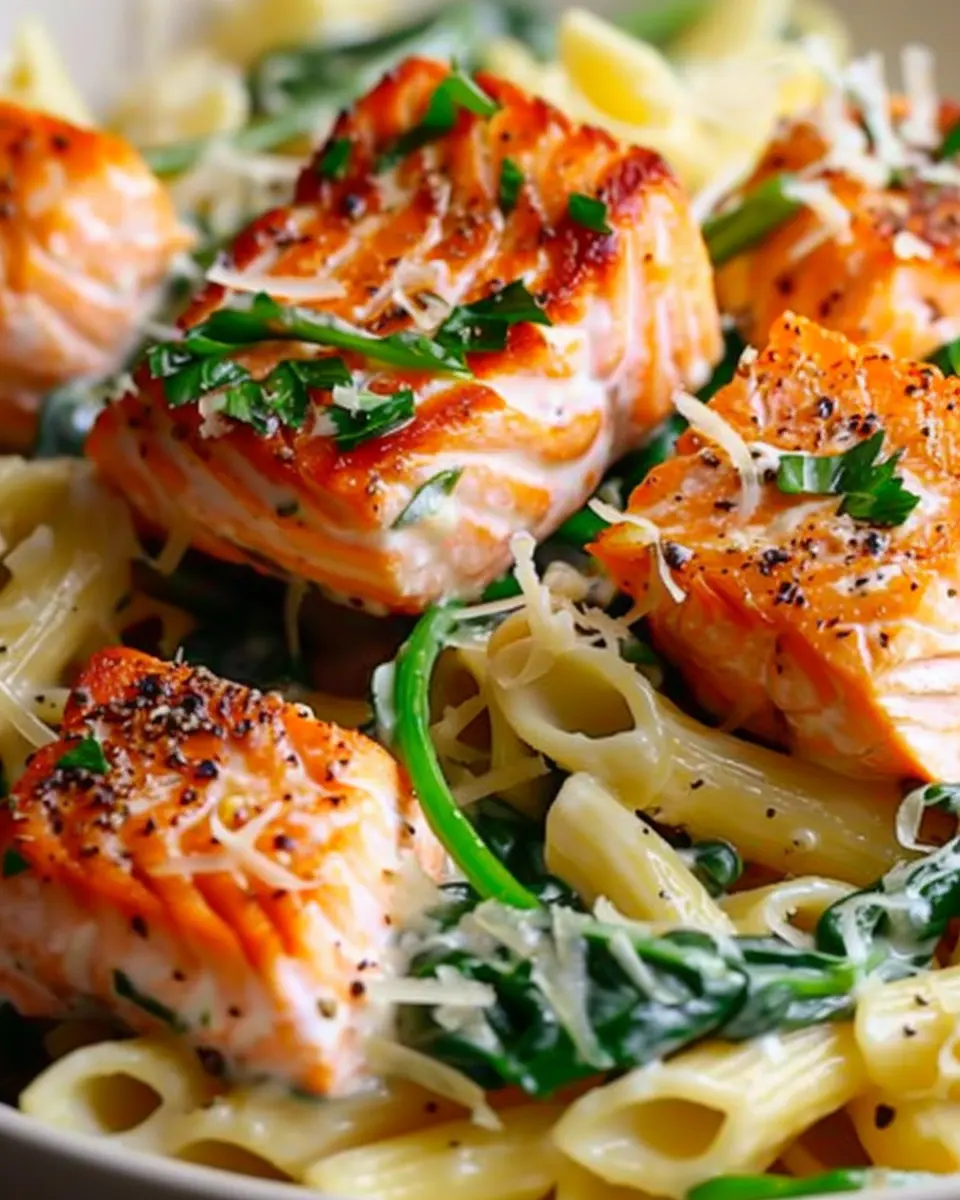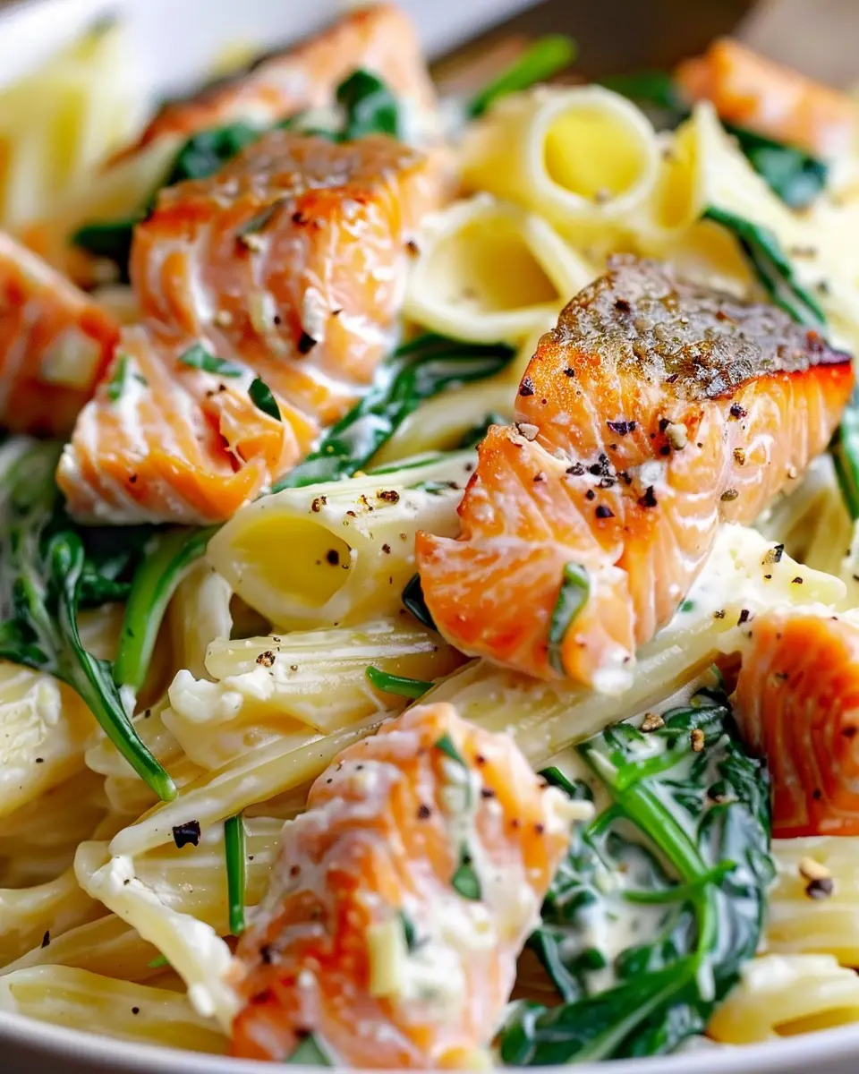 A delicious and nutritious Salmon Spinach Pasta Dish that combines the richness of salmon with the freshness of spinach, perfect for a healthy meal.