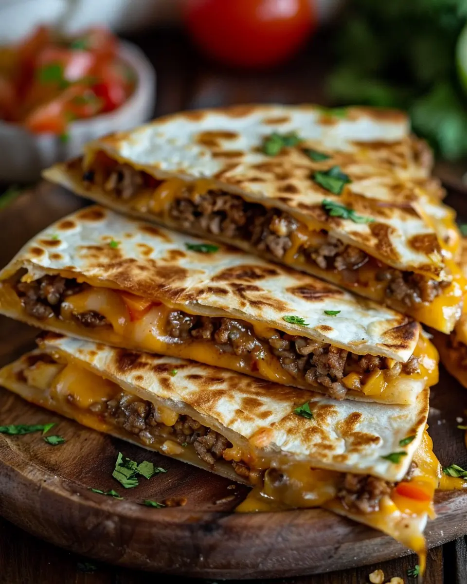 - Ground Beef: Look for lean ground beef for a juicy filling that doesnโt make your quesadilla soggy.