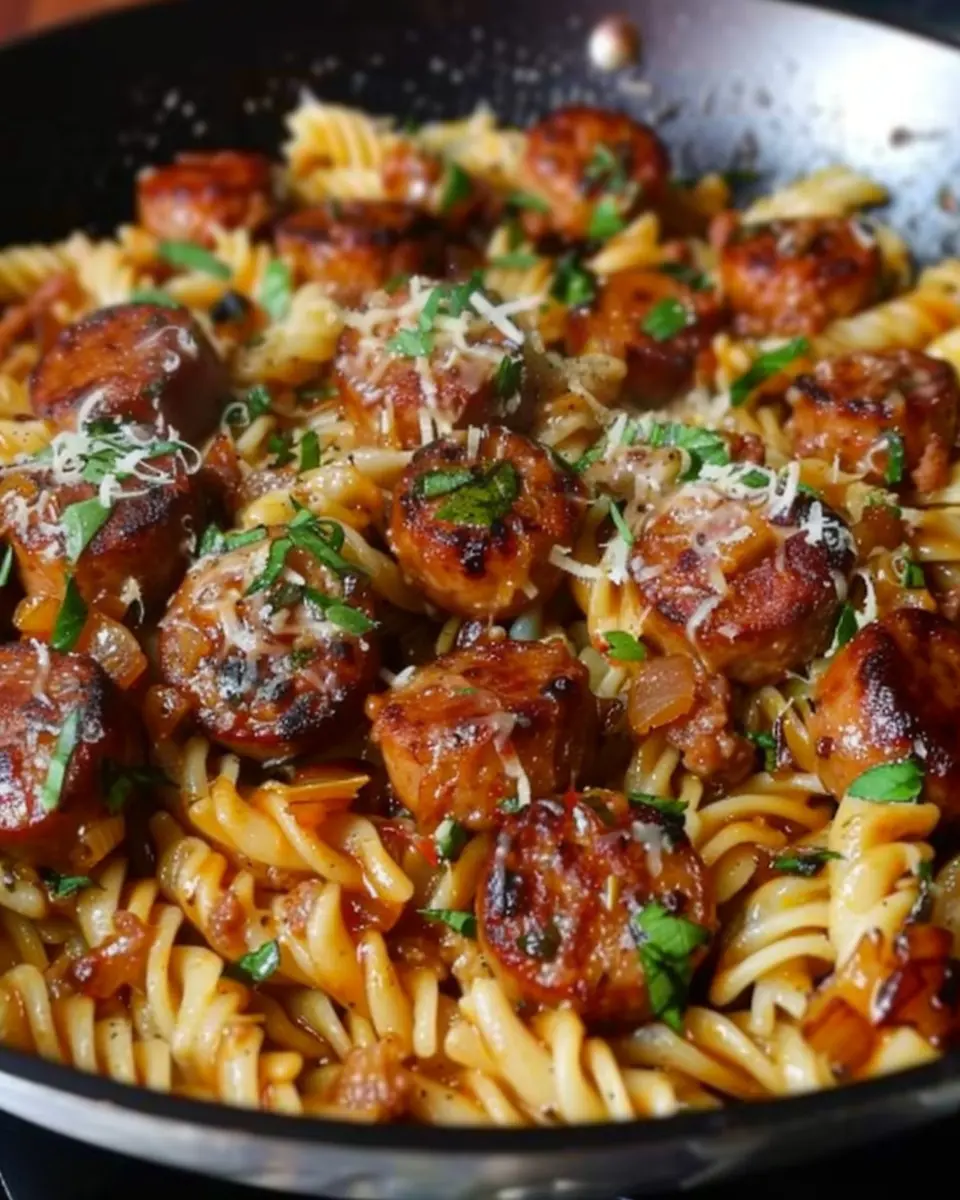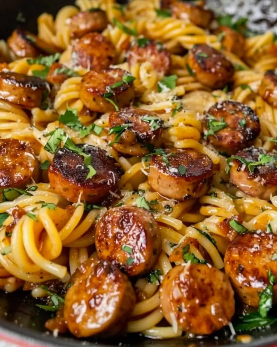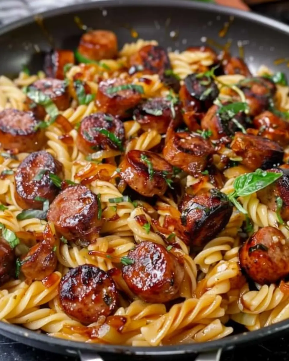 A delightful combination of sticky honey garlic sauce and sausage, bringing together flavors in a quick skillet pasta dish.