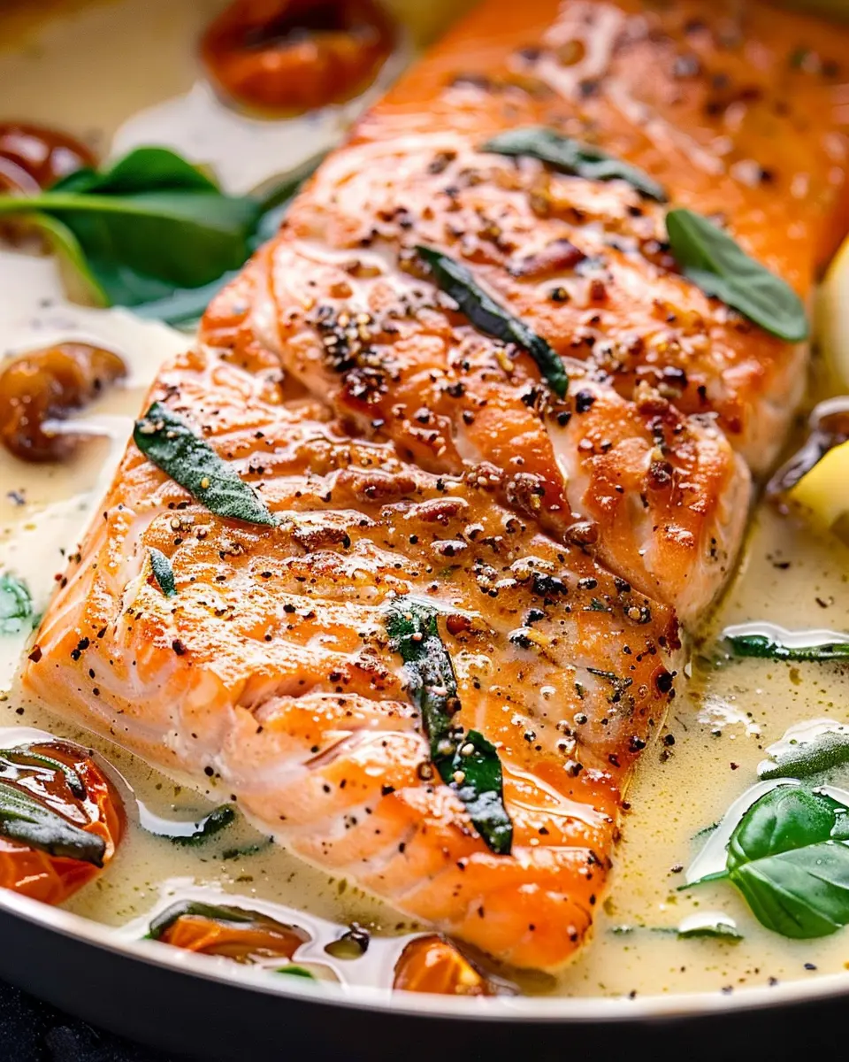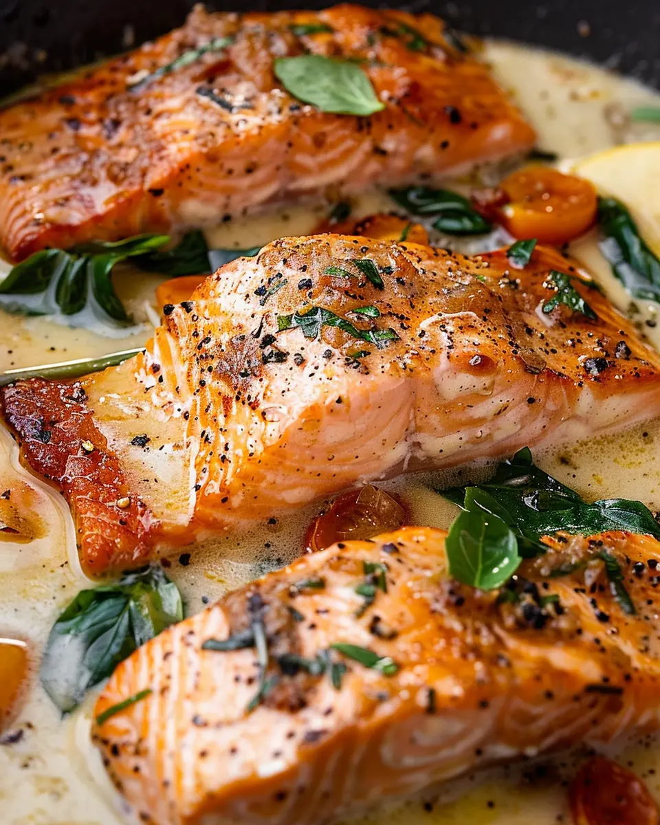2. Spoon the rich cream sauce over each fillet and let it simmer for 3-4 minutes, allowing the salmon to absorb those delectable flavors.